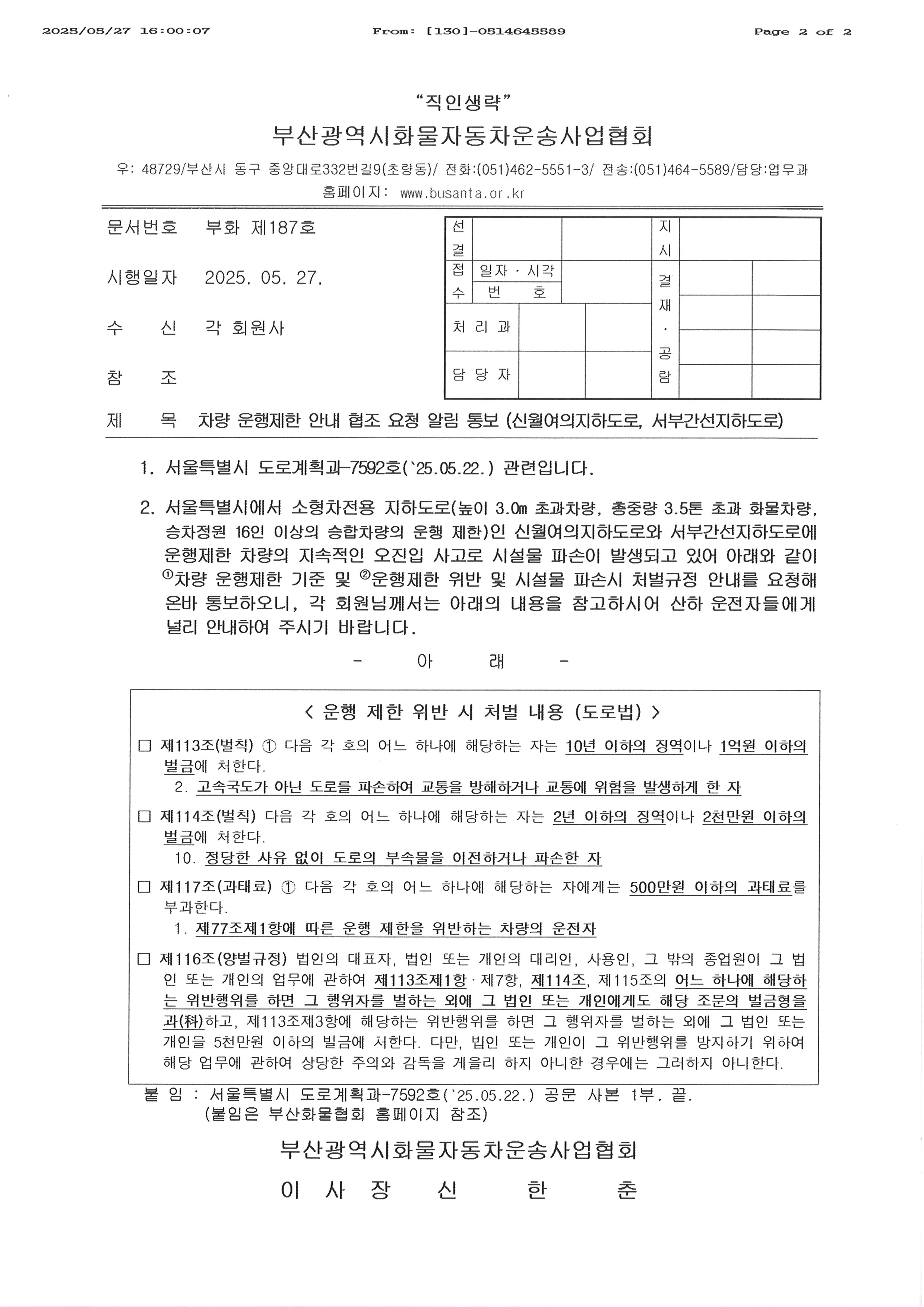 차량 운행제한 안내 협조 요청 알림 통보(신월여의지하도로, 서부간선지하도로)