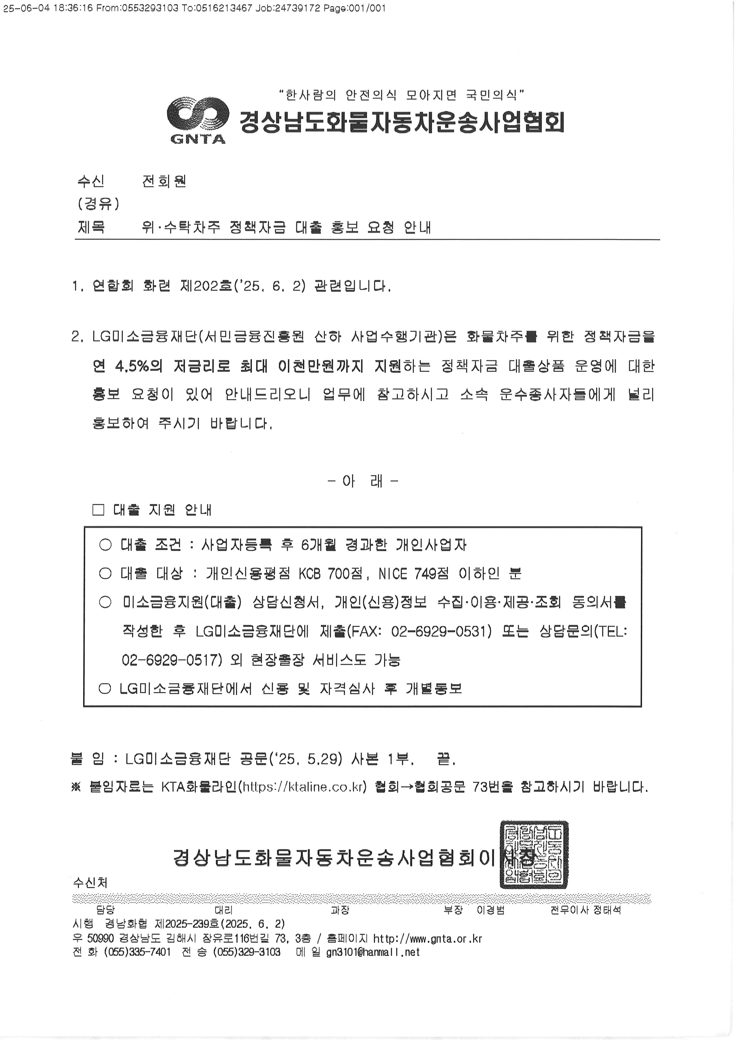 위수탁차주 정책자금 대출 홍보 요청 안내