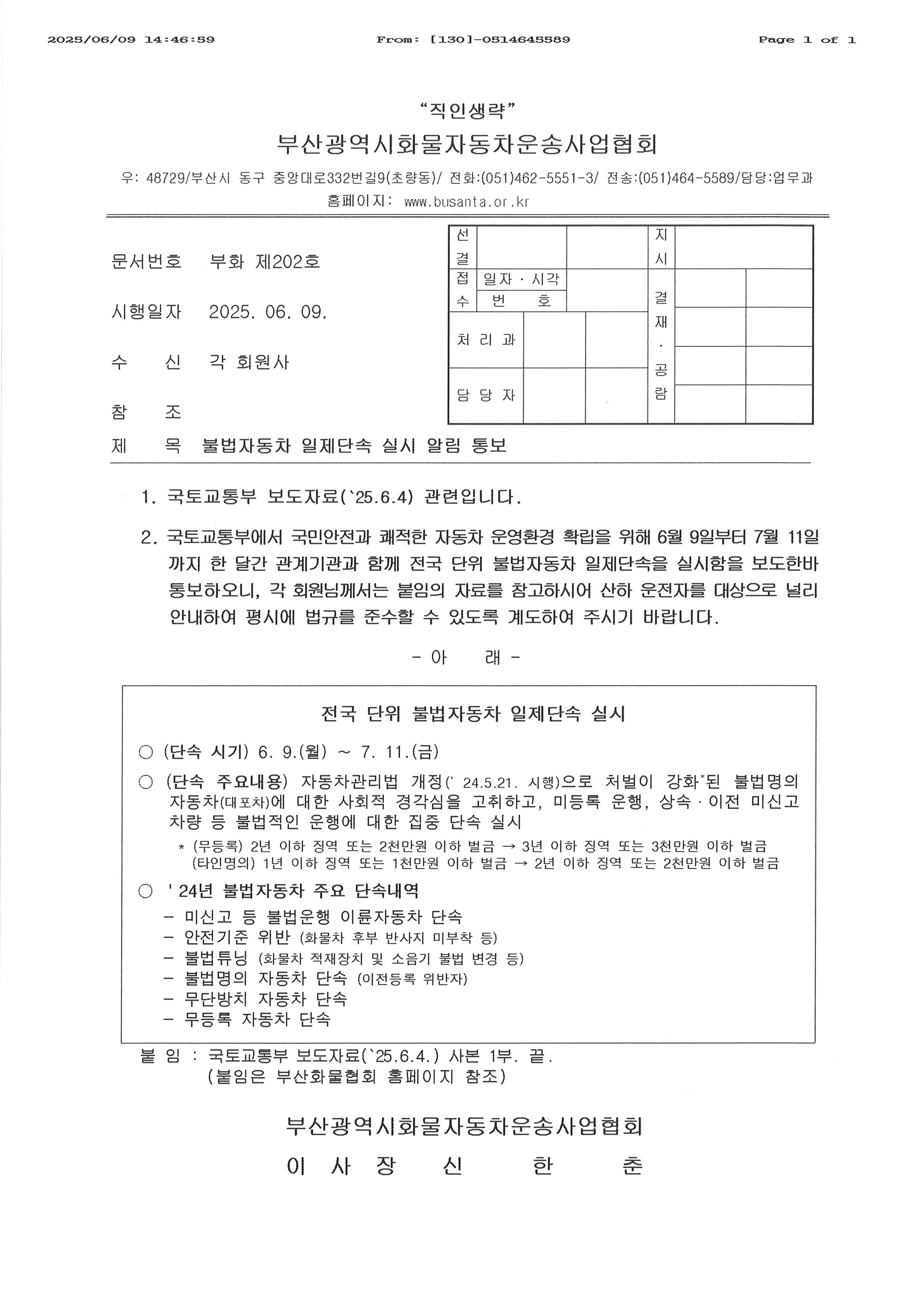 불법자동차 일제단속 실시 알림 통보