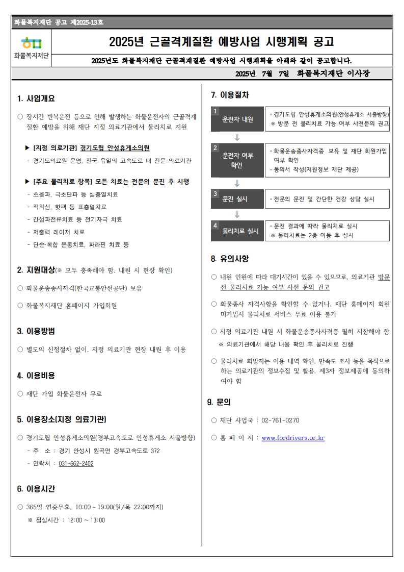 2. 화물복지재단에서 장시간 반복운전 등으로 인한 화물운전자의 근골격계 질환 예방과 건강 증진을 위해 「근골격계질환 예방사업」을 아래와 같이 시행하오니 각 시·도협회에서는 소속 회원들이 이용할 수 있도록 안내해 주시기 바랍니다.