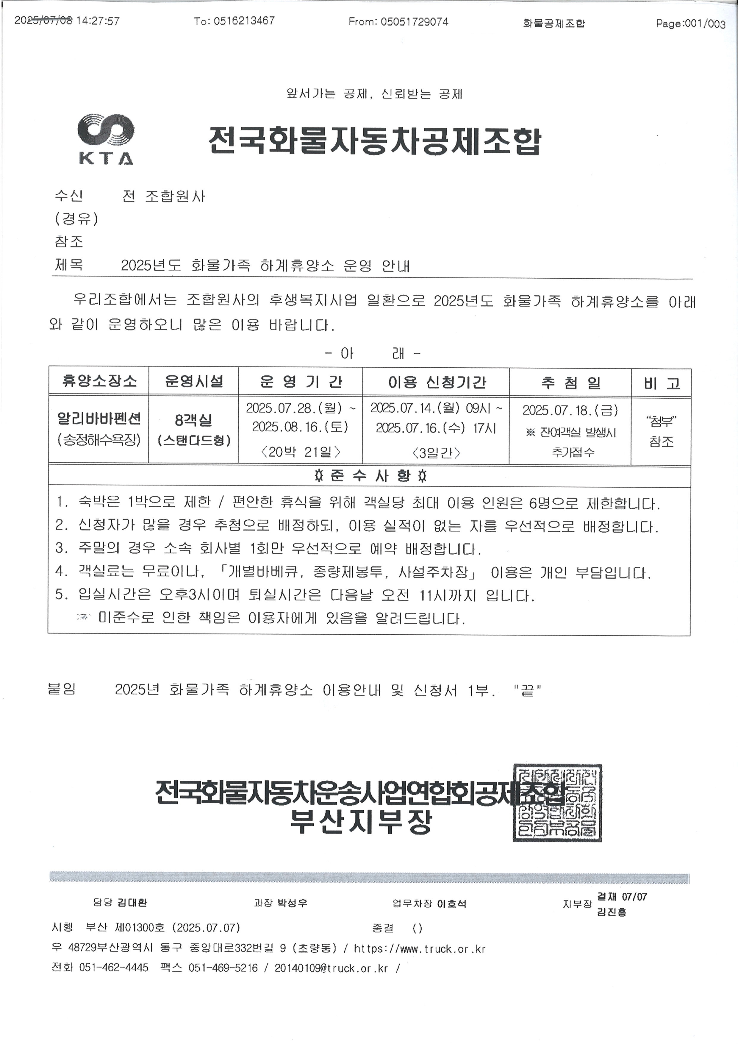 [부산화물공제]2025년도 화물가족 하계휴양소 운영 안내