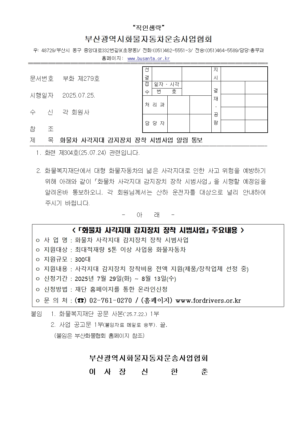 화물차 사각지대 감지장치 장착 시범사업 알림 통보