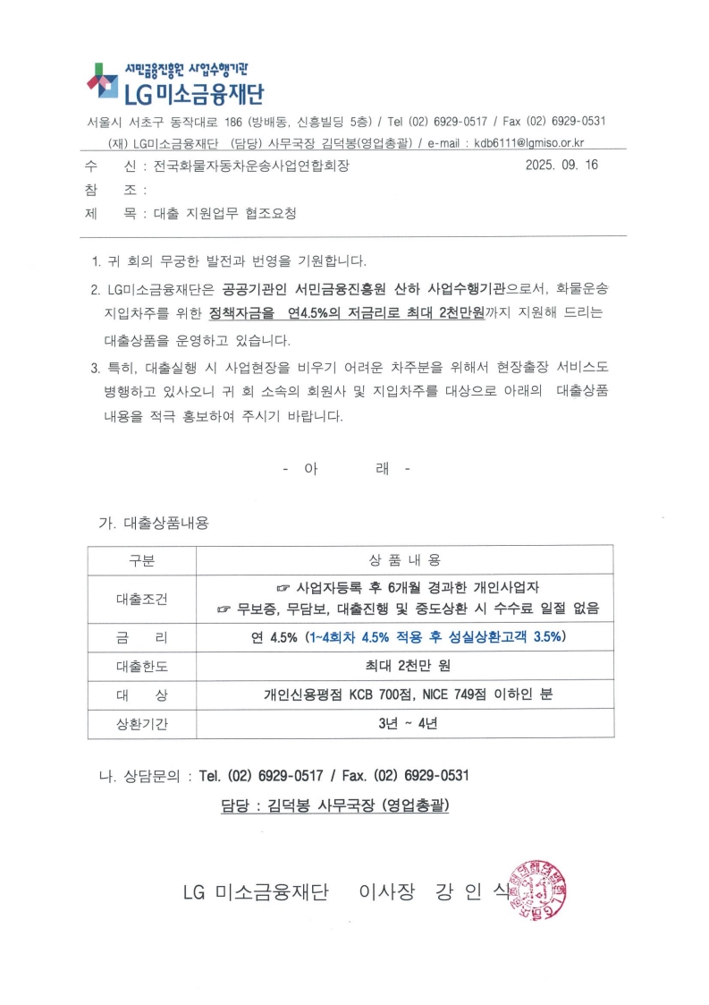 2. LG미소금융재단(서민금융진흥원 산하 사업수행기관)은 화물차주를 위한 정책자금을 연 4.5%의 저금리로 최대 이천만원까지 지원하는 정책자금 대출상품 운영에 대한 홍보 요청이 있어 안내드리오니 업무에 참고하시고 소속 운수종사자들에게 널리 홍보하여 주시기 바랍니다.