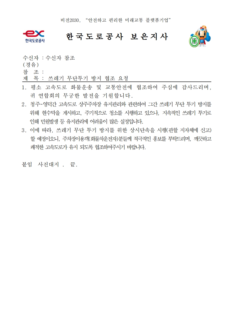 2. 한국도로공사 보은지사에서 청주~영덕간 상주주차장(휴게소) 유지관리와 관련하여, 지속적인 쓰레기 투기로 인해 민원이 발생하는 등 어려움이 계속됨에 따라 쓰레기 무단투기 방지를 위한 상시단속을 시행*할 예정임을 안내드리오니 업무에 참고하시고 소속 운전자들에게 널리 홍보하시어 단속으로 인한 불이익을 받는 사례가 없도록 하시기 바랍니다.