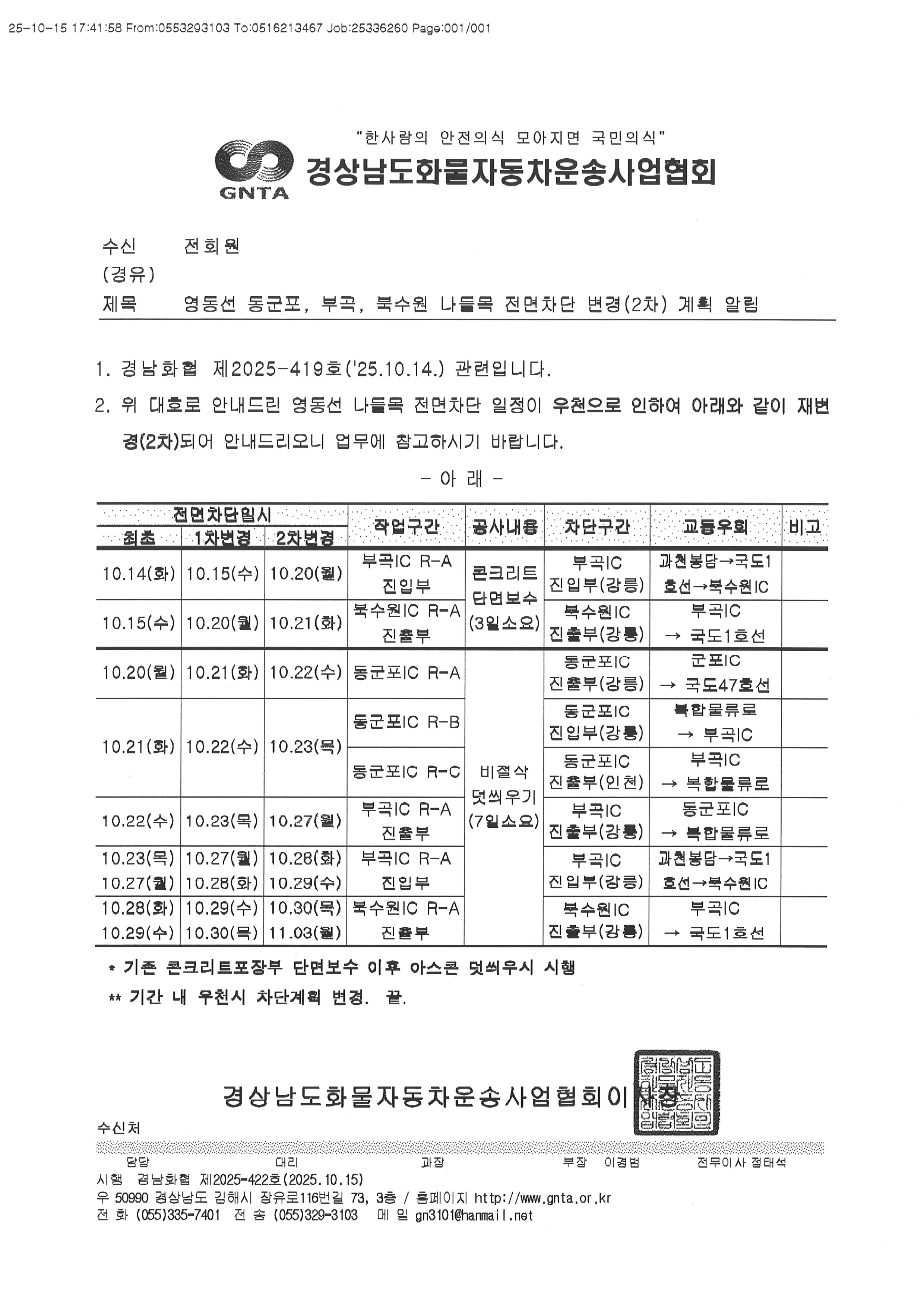 영동선 동군포, 부곡, 북수원 나들목 전면차단 변경(2차) - 우천으로 인한 변경 알림