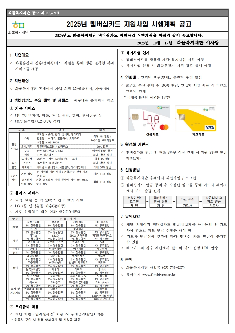2. 화물복지재단에서 화물운전자 및 그 가족 등을 대상으로 생활 밀착형 복지서비스 제공을 위해 아래와 같이 화물차 전용 멤버십카드 지원사업을 시행하게 되어 안내드리오니 소속 운수종사자에게 널리 홍보하여 주시기 바랍니다.