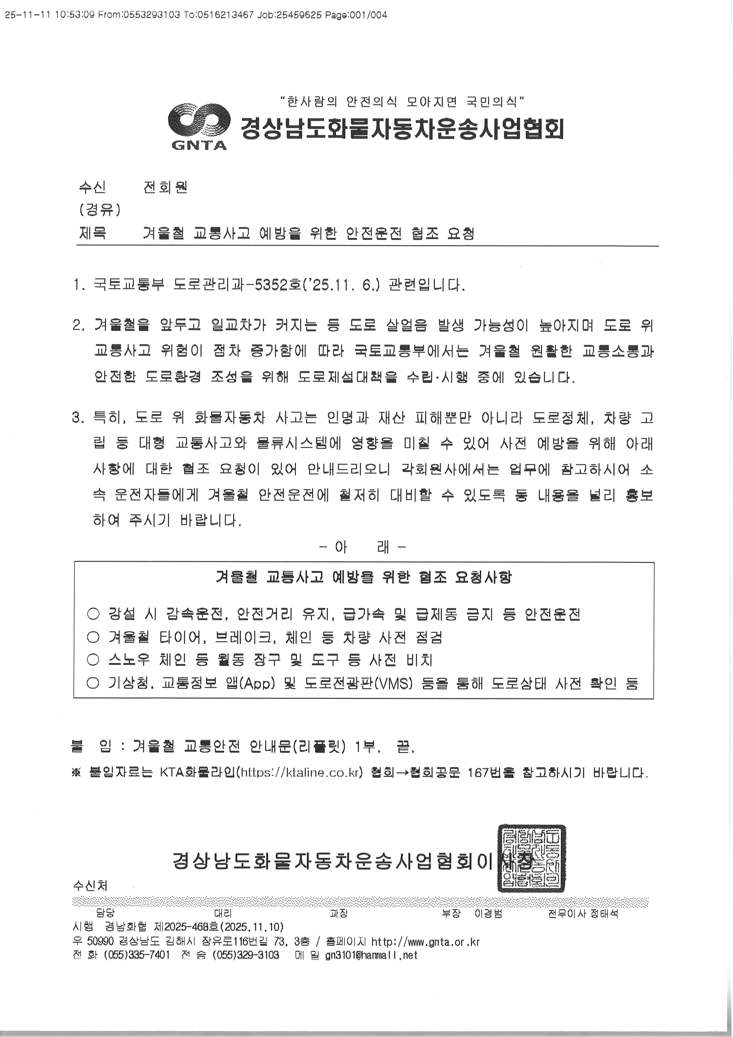 겨울철 교통사고 예방을 위한 안전운전 협조 요청