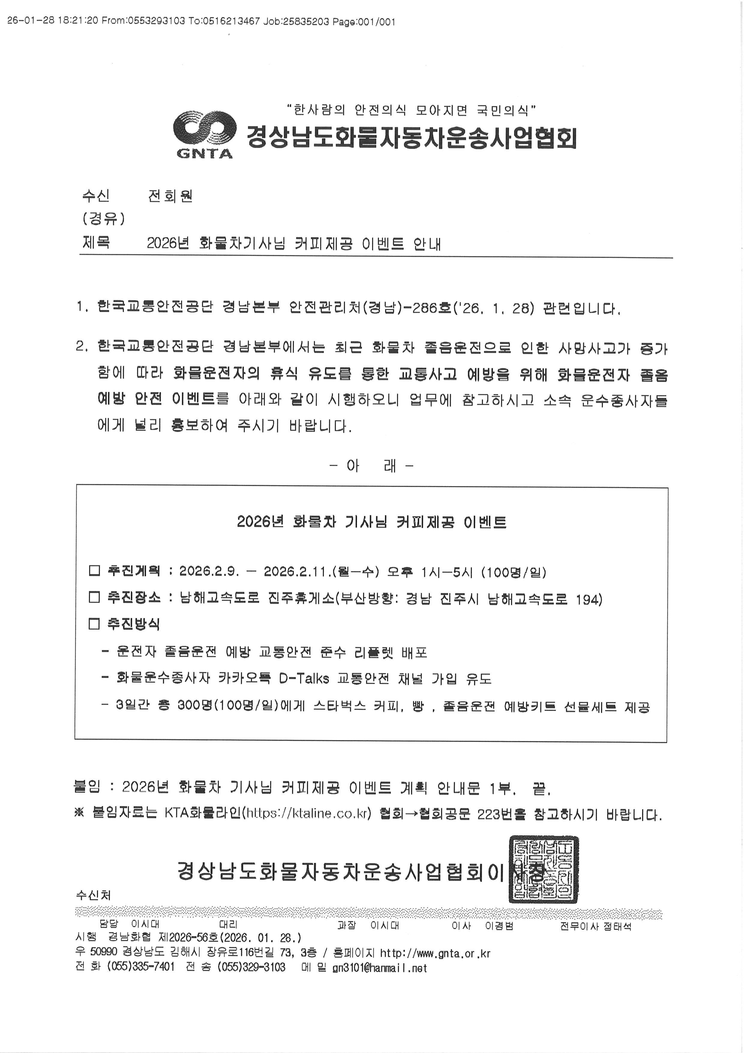 2026년 화물차기사님 커피제공 이벤트 안내
