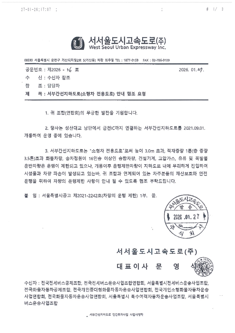 붙 임 : 서서울도시고속도로 제2026-36호(`26.1.27) 공문 사본 1부. 끝.
