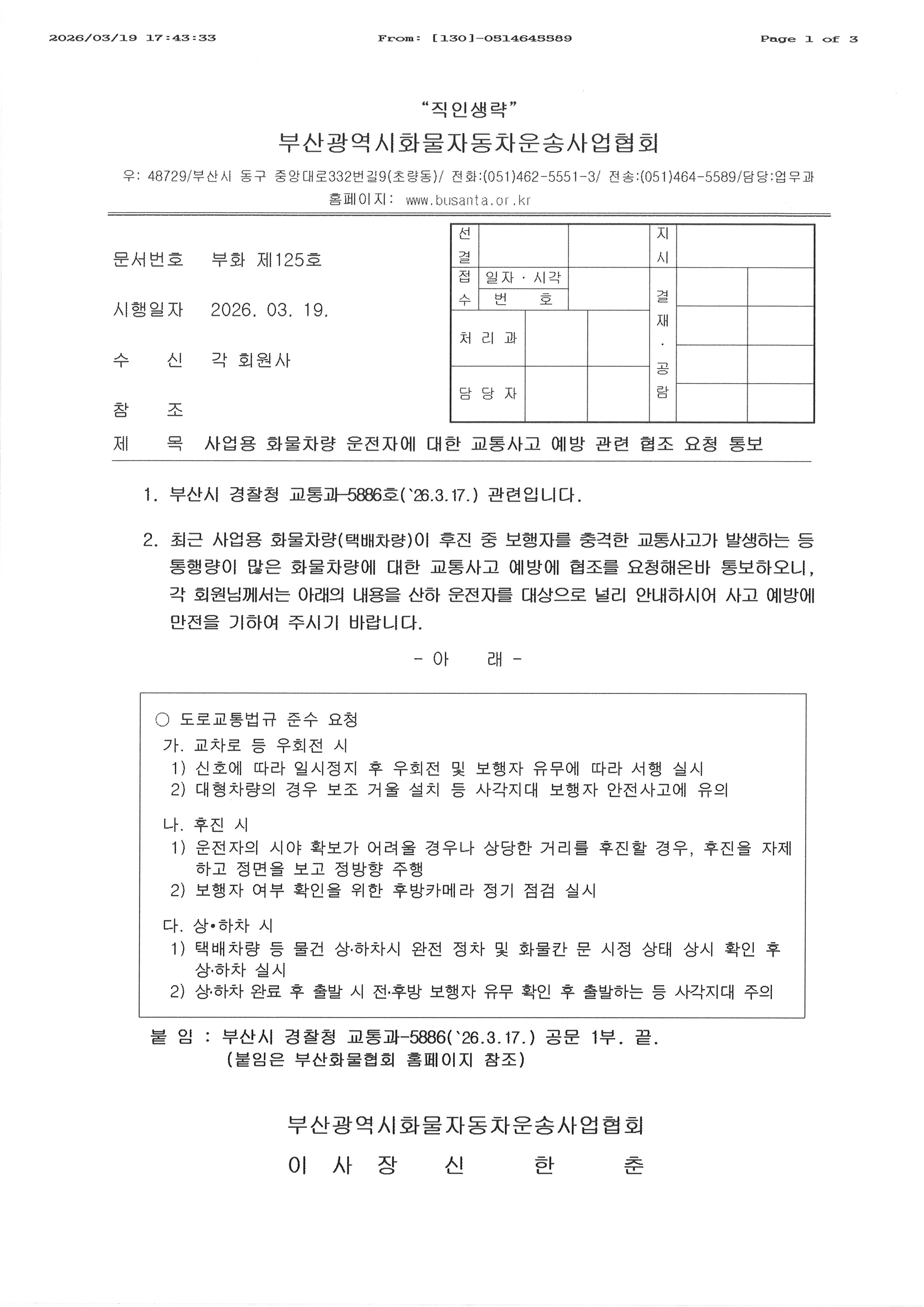 사업용 화물차량 운전자에 대한 교통사고 예방 관련 협조 요청 통보