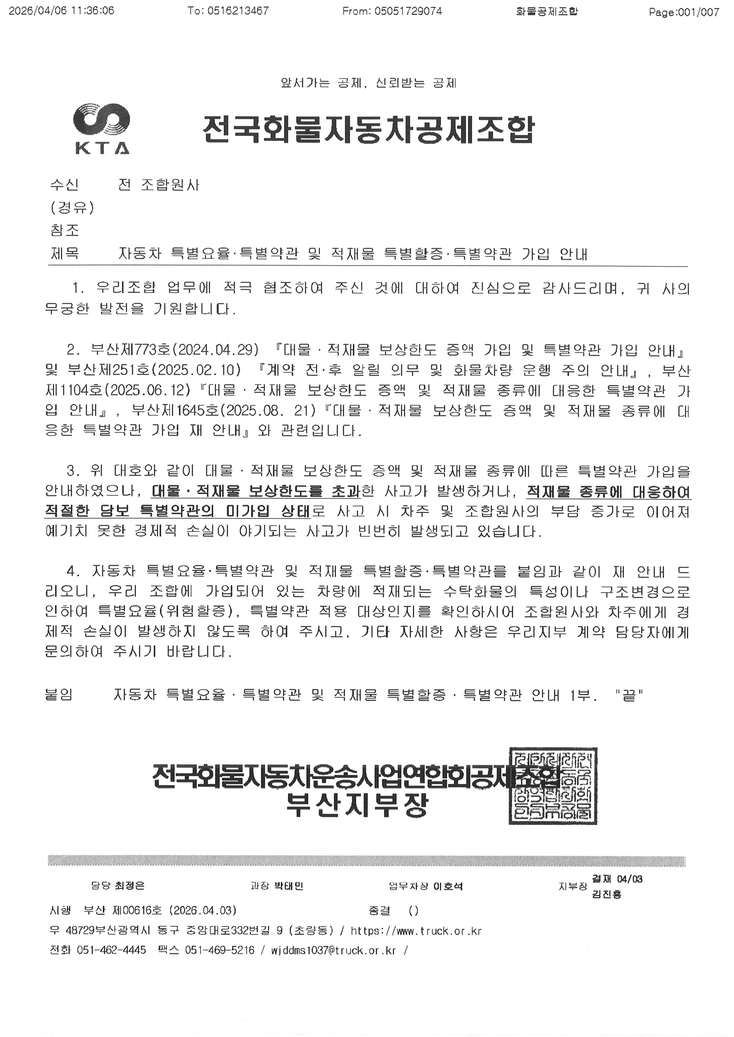 자동차 특별효율.특별약관 및 적재물 특별할증 . 특별약관 가입 안내 관리자 1 42 04.06 13:40 2026.04.06 13:40 20260406132649.pdf (292.2K) + 1