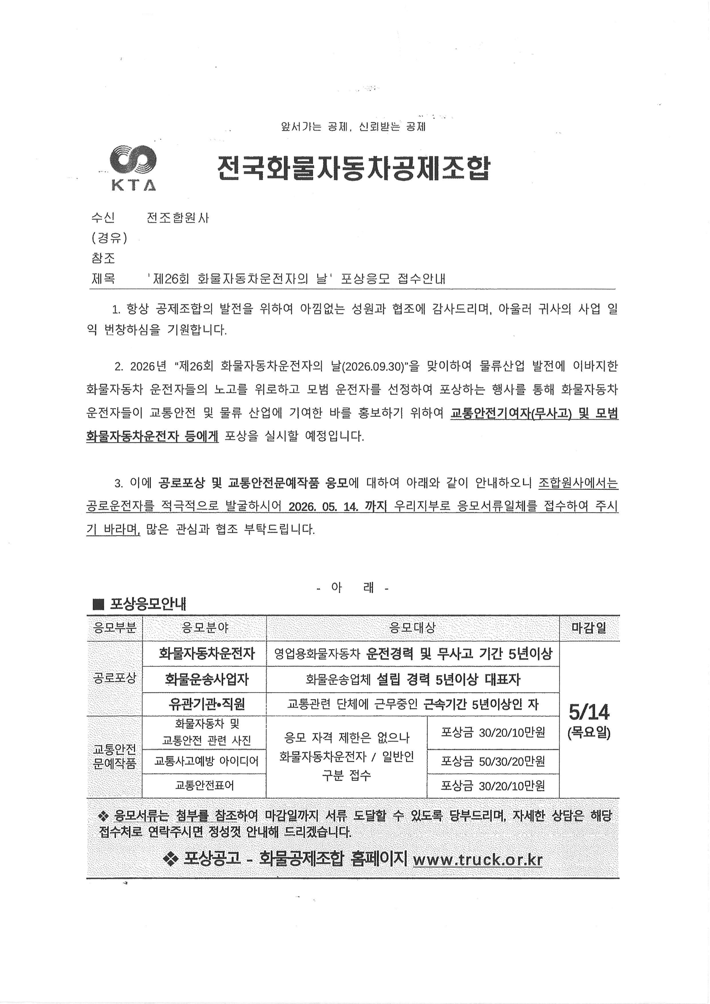 "제26회 화물자동차운전자의 날 " 포상응모 접수안내