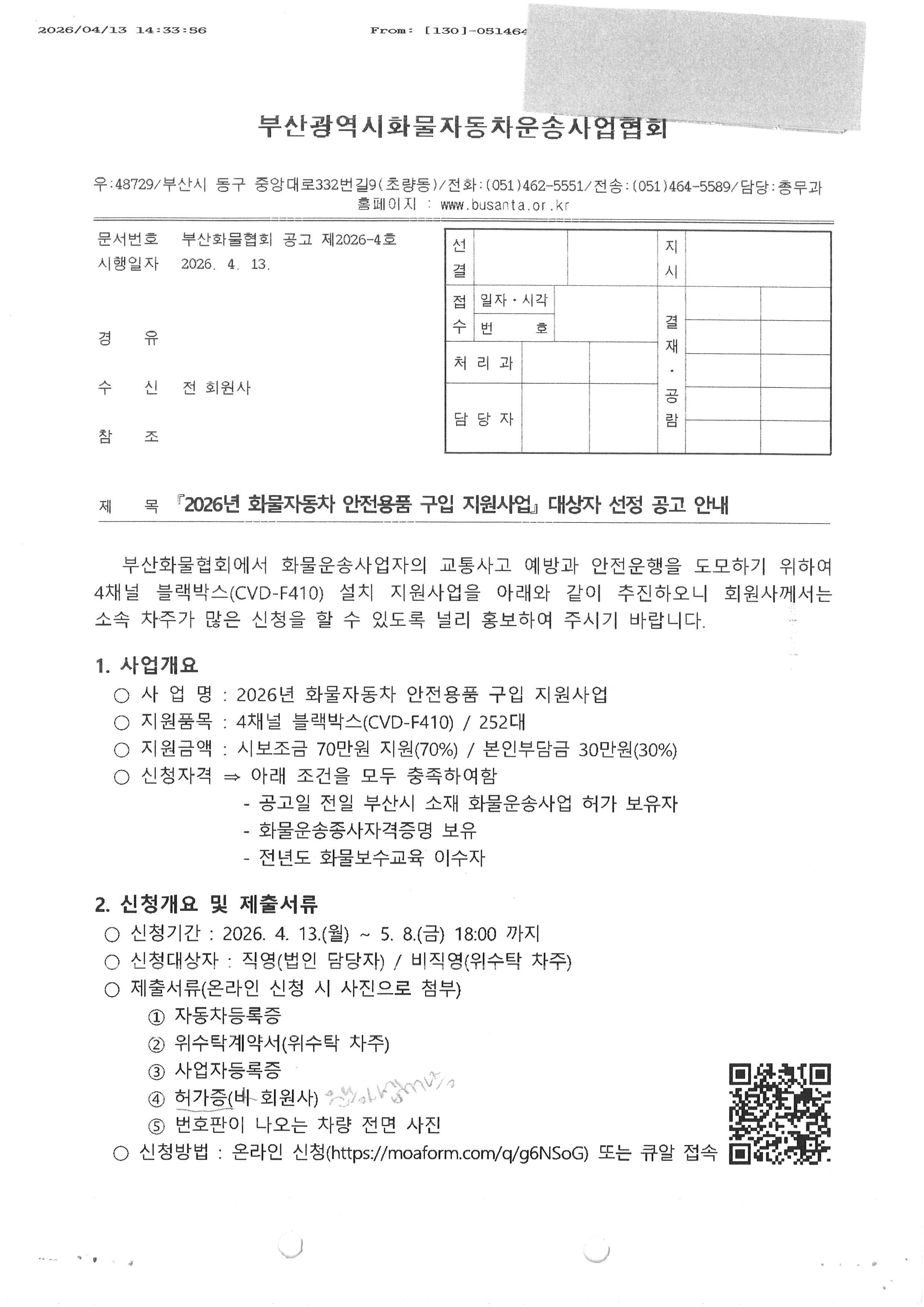 "2026년 화물자동차 안전용품 구입 지원사업 "대상자 선정 공고 안내 - (부산시 소재 화물운송사업 허가 보유자 한함 )